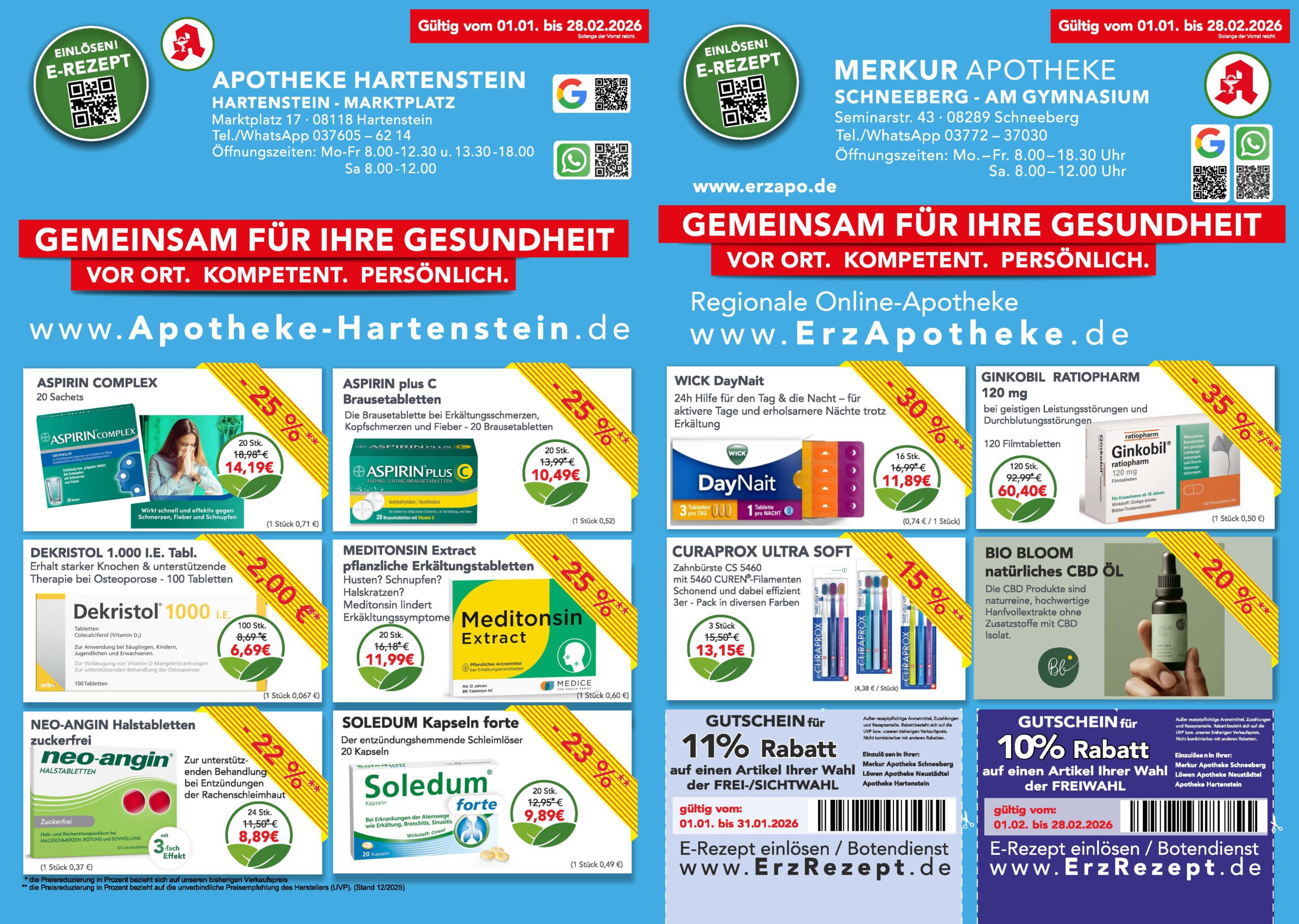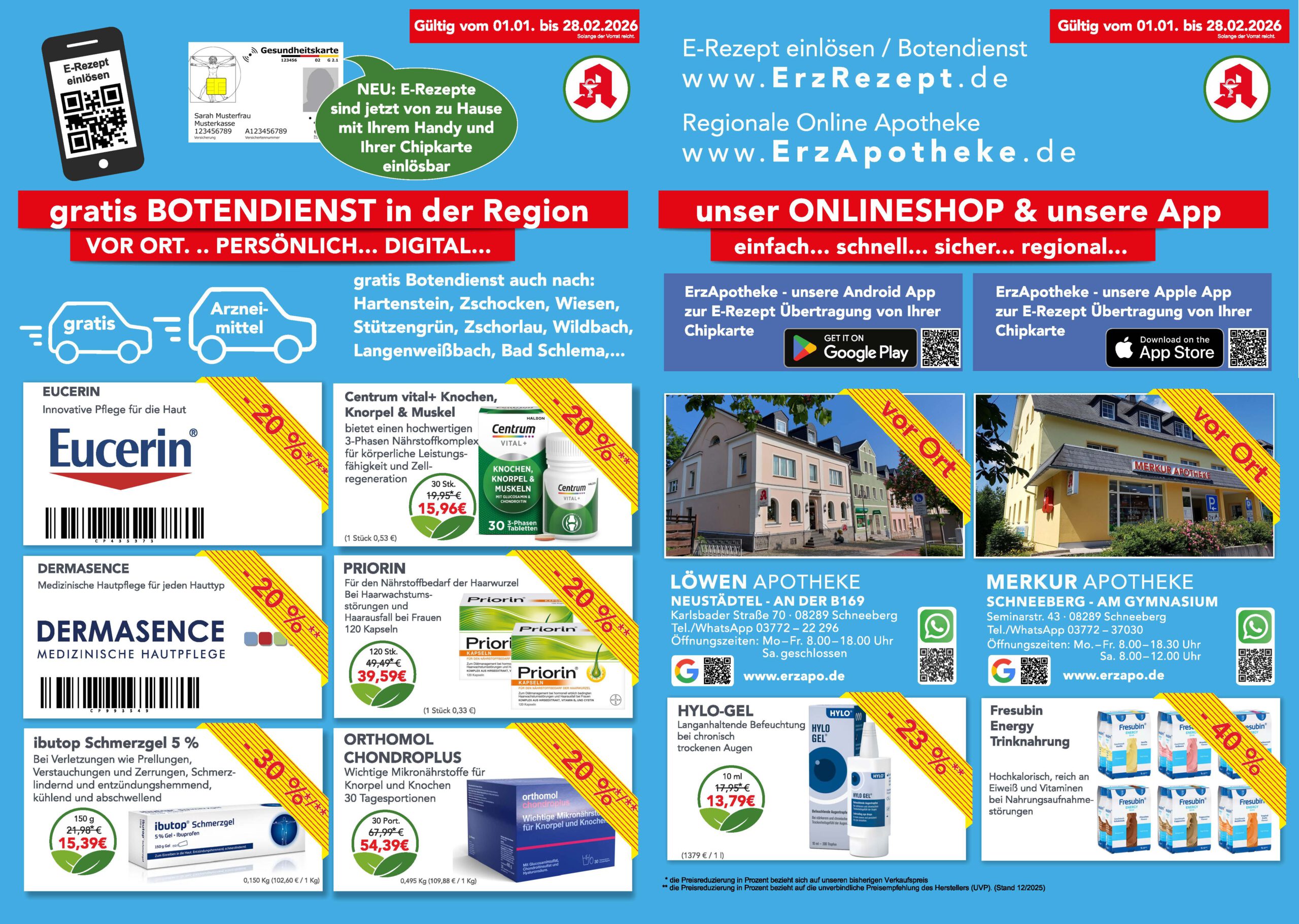 “Unsere Stärke ist und bleibt die persönliche Beratung vor Ort. Sie wollen aber auch außerhalb unserer Öffnungszeit die Verfügbarkeit eines Medikamentes prüfen oder direkt online vorbestellen? Dann besuchen Sie unseren regionalen Apotheken Online-Shop: www.ErzApotheke.de”